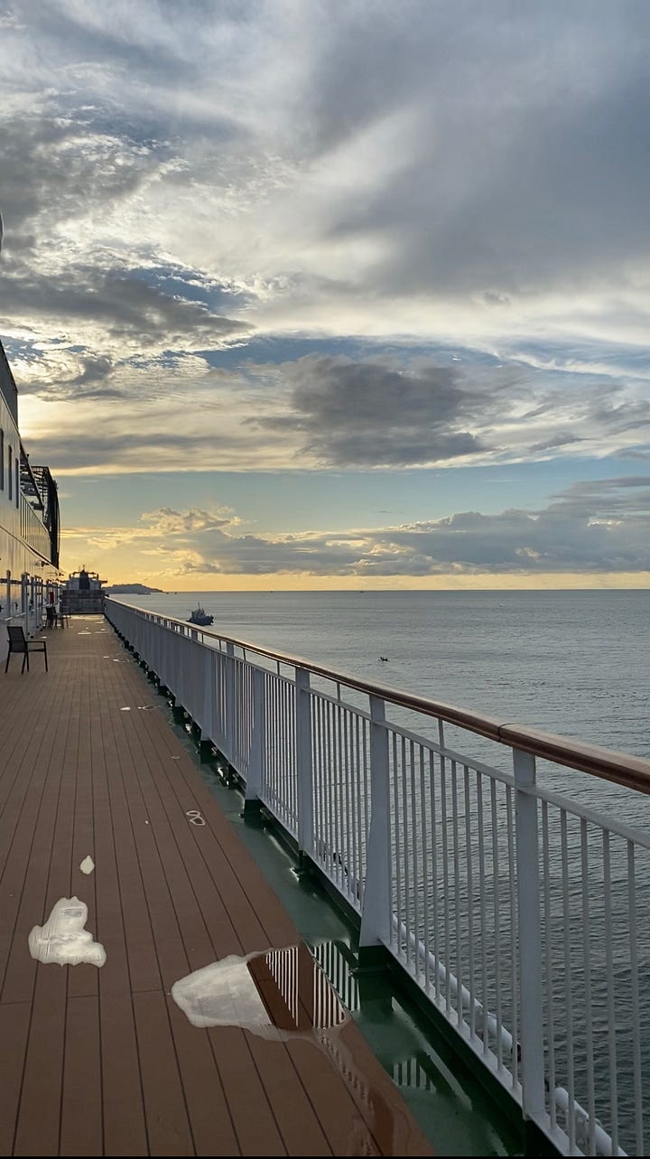 I’ve settled into a nice routine on board and am loving morning quiet time with beautiful views overlooking the city or the sea as the sun lights up the new day.