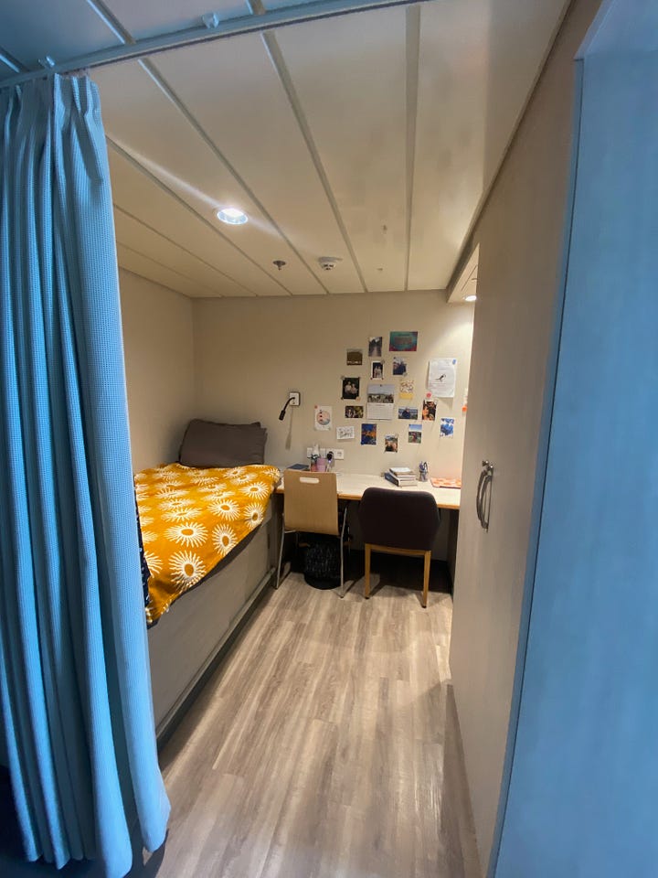 We do our own washing in the crew laundry but you have to book a time slot for one of the 15 washers and dryers. This is definitely a case of ‘if you snooze you lose’ because you have a 10 minute window to get your washing in or out otherwise it’s up for grabs for the next person!